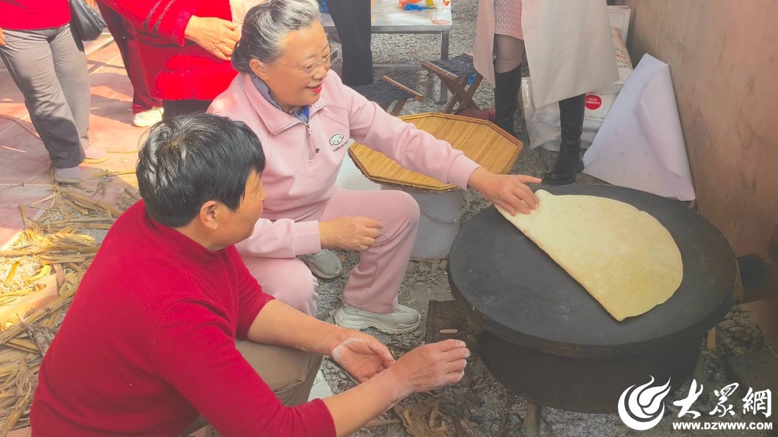 最热闹的,还是杜老师撸起袖子加入擀饼队伍。她和乡亲们围在案板前,揉面、揪剂子、擀薄饼,一边忙活一边拉家常。“这饼要擀得圆,日子才过得团团圆圆。”她学着大娘的手势,擀出的饼虽不太规整,却惹得一片欢笑。灶火映红了大家的脸,一张张薄饼出锅,卷上大葱和酱,咬一口,满是家乡的味道。