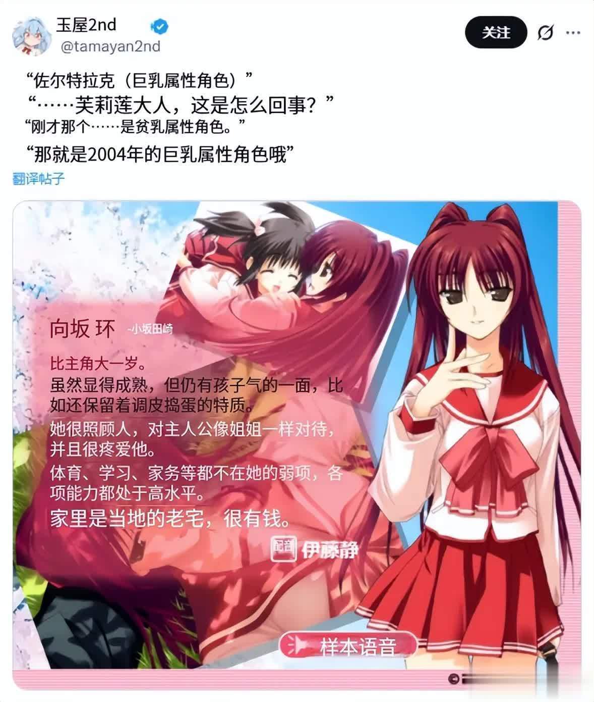 帖子中提到的女角色向坂环,人称“环姐”,出自2004年发售的旮旯给木《ToHeart2》。按照官方设定,环姐的三围是:89/58/82,有网友据此推测环姐至少是个D。