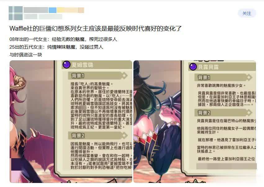 一个典型的例子就是旮旯给木大厂Waffle社。Waffle社招牌系列《巨儒幻想》的女主,在角色设定上就发生了不小的变化。从立绘上看,外在还是一如既往的大,但角色内核其实更接近纯情萧楚女。说白了,主打的就是一种反差感。